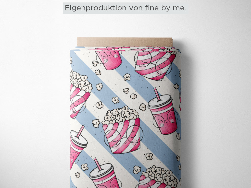 Exklusive Eigenproduktion „Popcorn Time“, Stoff mit einem allover Popcorn-Motiv und Getränken auf diagonal gestreiftem Hintergrund mit Sprenkeln