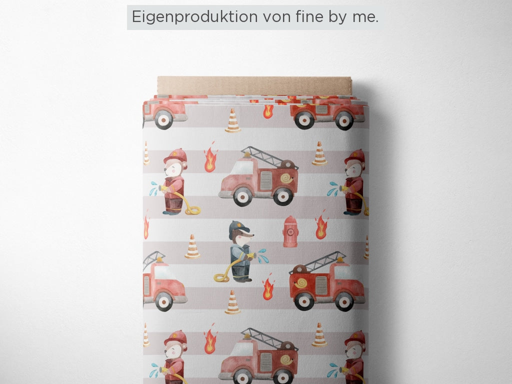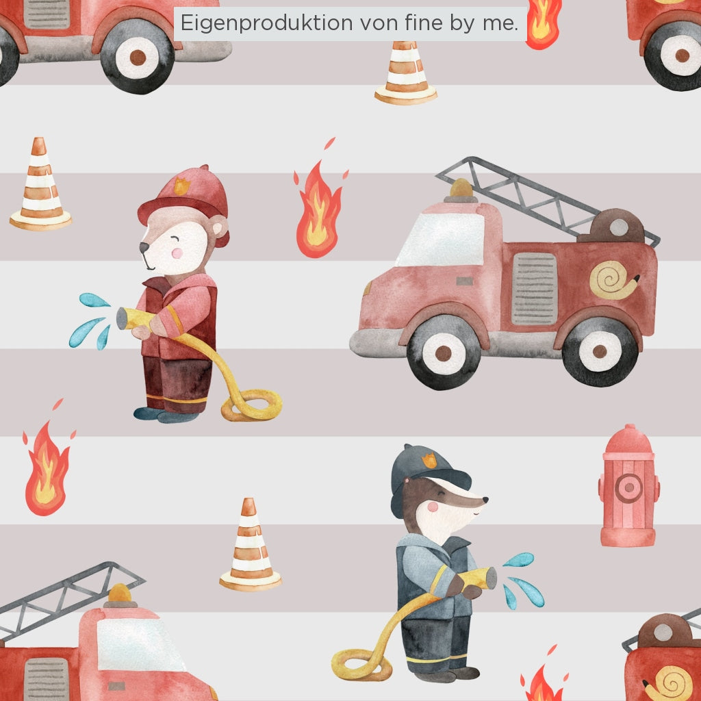 Exklusive Eigenproduktion „Die Feuerwehr ist da“, Stoff mit einem allover Feuerwehr-Motiv mit Bär und Dachs auf beige gestreiftem Hintergrund